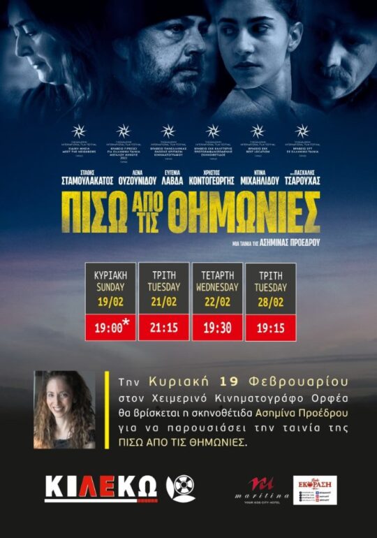 Στις 19/2 θα βρίσκεται κοντά μας η σκηνοθέτιδα Ασημίνα Προέδρου παρουσιάζοντας τη ταινία σε μια ειδική προβολή με την υποστήριξη της Κι.Λε.Κω. Την προβολή θα πλαισιώσει συζήτηση για το σύγχρονα κοινωνικά ζητήματα που αγγίζει η ταινία – γνωριμία με το κοινό.