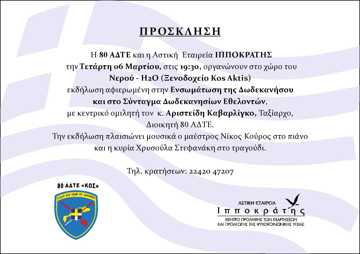Πρόσκληση για εκδήλωση της Αστικής Εταιρείας ΙΠΠΟΚΡΑΤΗΣ, με κεντρικό ομιλητή τον κο Αριστείδη Καβαρλίγκο, Ταξίαρχο, Διοικητή 80 ΑΔΤΕ (την εκδήλωση πλαισιώνει μουσικά ο μαέστρος Νίκος Κούρος στο πιάνο και η  κα Χρυσούλα Στεφανάκη στο τραγούδι)