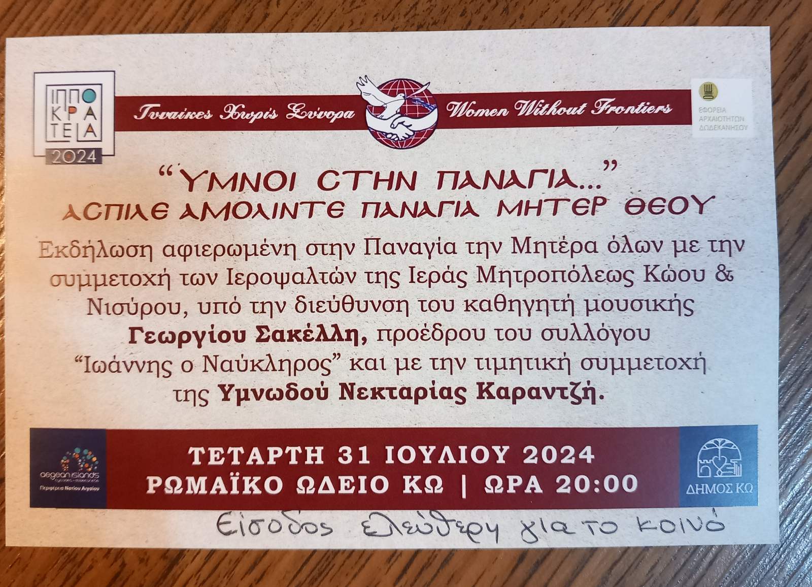 Πρόσκληση για την Εκδήλωση ” Ύμνοι στην Παναγία” από την οργάνωση Γυναίκες Χωρίς Σύνορα τμήμα Κω.
