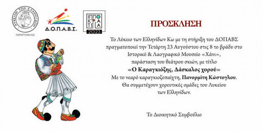 Παράσταση του Θεάτρου Σκιών με τίτλο ΄΄ Ο Καραγκιόζης δάσκαλος χορού΄΄ με τον νεαρό καραγκιοζοπαίχτη Πανορμίτη Κώστογλου διοργανώνει το Λύκειο Ελληνίδων Κω και ο ΔΟΠΑΒΣ στα Θερινά Ιπποκράτεια την Τετάρτη 23 Αυγούστου στις 8 το βράδυ στο Ιστορικό και Λαογραφικό Μουσείο Κω ( Χάνι).