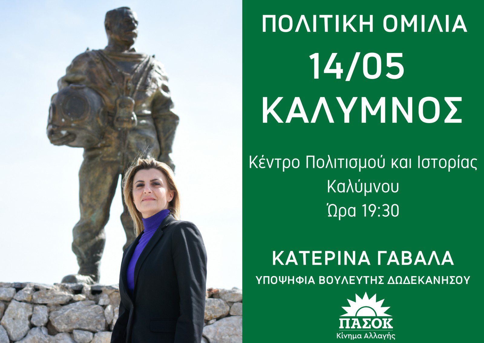 Σας προσκαλούμε στην Προεκλογική Ομιλία της υποψήφιας Βουλευτού ΠΑΣΟΚ-ΚΙΝΑΛ Δωδεκανήσου κ. Κατερίνας Γαβαλά στην Κάλυμνο την Κυριακή 14 Μαΐου 2023.
