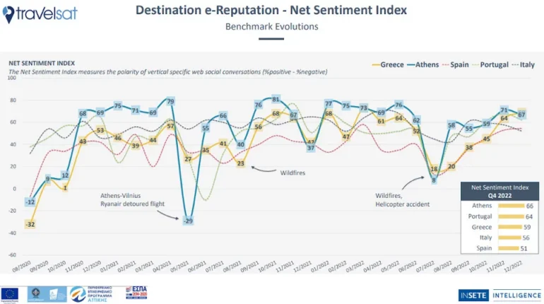 Tο net sentiment score (NSI) της Ελλάδας ξεπέρασε το αντίστοιχο της Ιταλίας και της Ισπανίας για όλο το Q4, ενώ το net sentiment score της Αθήνας ήταν υψηλότερο από εκείνο των ανταγωνιστικών προορισμών.
