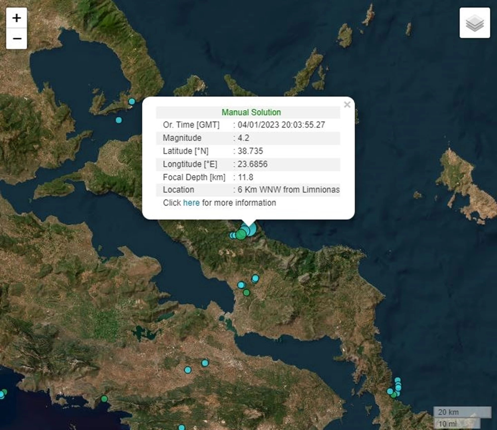 Σύμφωνα με την επικαιροποιημένη λύση του Γεωδυναμικού Ινστιτούτου, το επίκεντρο του σεισμού εντοπίζεται 5χλμ ανατολικά των Ψαχνών ενώ το εστιακό του βάθος υπολογίζεται στα 13,2 χλμ.
