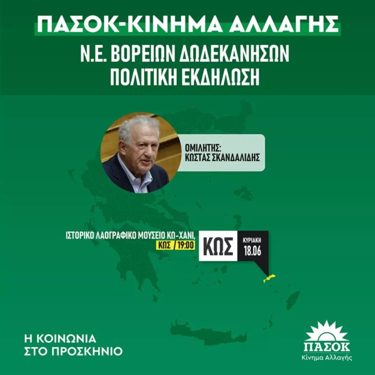 Προεκλογικές συγκεντρώσεις με ομιλητή τον Κώστα Σκανδαλίδη διοργανώνει στην Κάλυμνο και την Κω την προσεχή Κυριακή η Νομαρχιακή Επιτροπή Βόρειας Δωδεκανήσου του ΠΑΣΟΚ-ΚΙΝΑΛ.