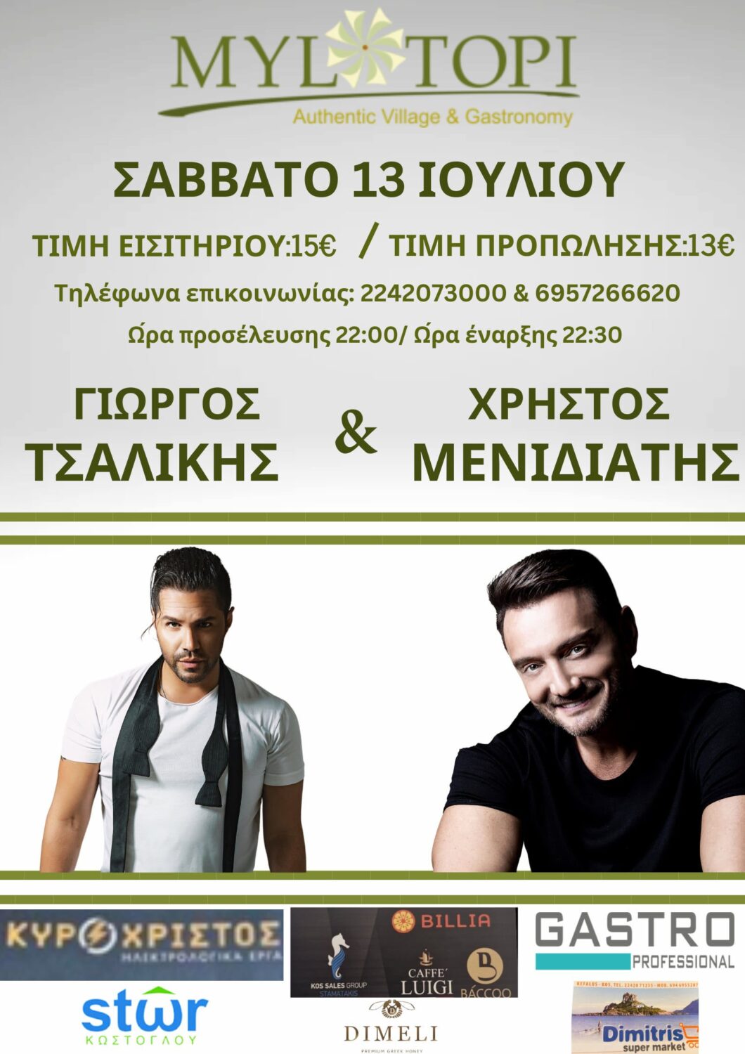 Home»ΡΟΗ ΕΙΔΗΣΕΩΝ»Στην Κω στις 13 Ιουλίου στο MYLOTOPI ο Γιώργος Τσαλίκης και ο Χρήστος Μενιδιάτης.