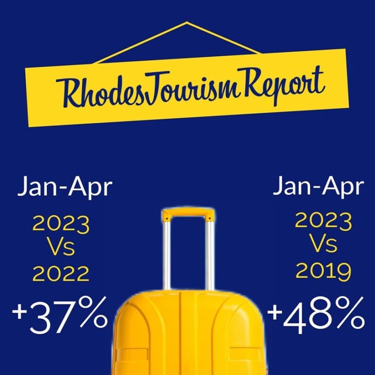 Η Ρόδος, αντίστοιχα, στο τετράμηνο ΙΑΝ-ΑΠΡ 2023, εμφανίζει αύξηση 37% σε σύγκριση με το 2022 και 48% σε σύγκριση με το 2019.