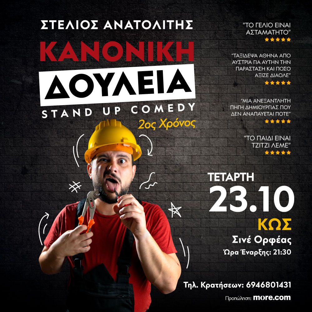 ΣΤΕΛΙΟΣ ΑΝΑΤΟΛΙΤΗΣ – ΚΑΝΟΝΙΚΗ ΔΟΥΛΕΙΑ |STAND UP COMEDY |ΤΕΤΑΡΤΗ 23 ΟΚΤΩΒΡΙΟΥ 21:30