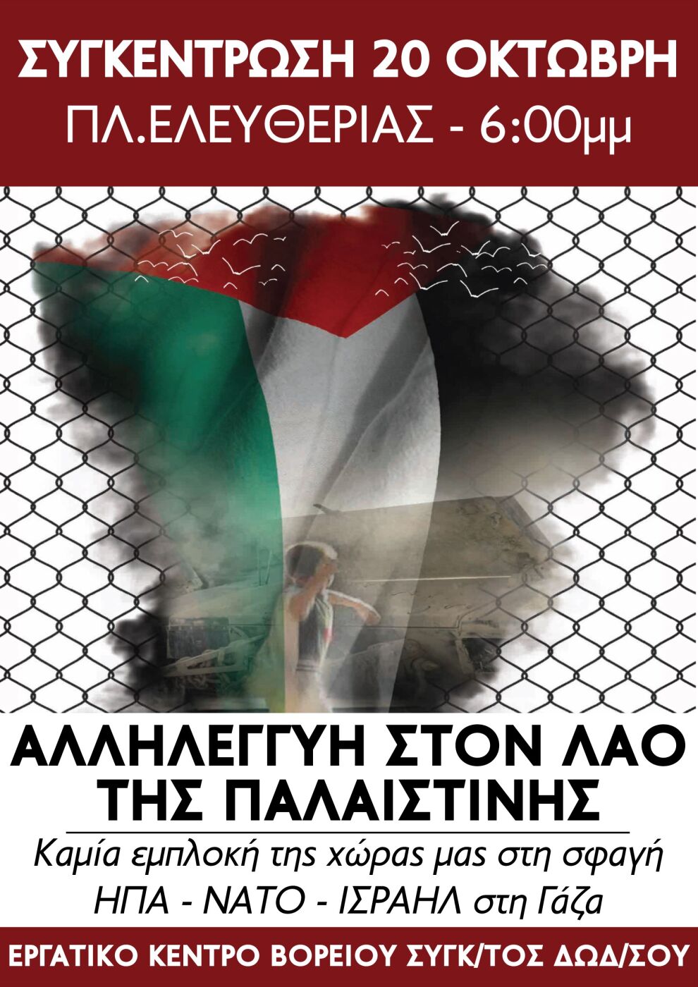 Συγκέντρωση διαμαρτυρίας για τις εξελίξεις στην Παλαιστίνη. θα πραγματοποιήσει το Εργατικό Κέντρο την Παρασκευή 20 Οκτωβρίου στις 18:00 στην Πλατεία Ελευθερίας.
