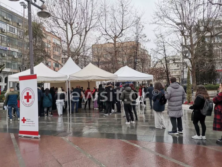 Στην Πλατεία της Λάρισας δημιουργήθηκαν τεράστιες ουρές από ανθρώπους όλων των ηλικιών που περίμεναν καρτερικά να αιμοδοτήσουν για τους τραυματίες των Τεμπών.