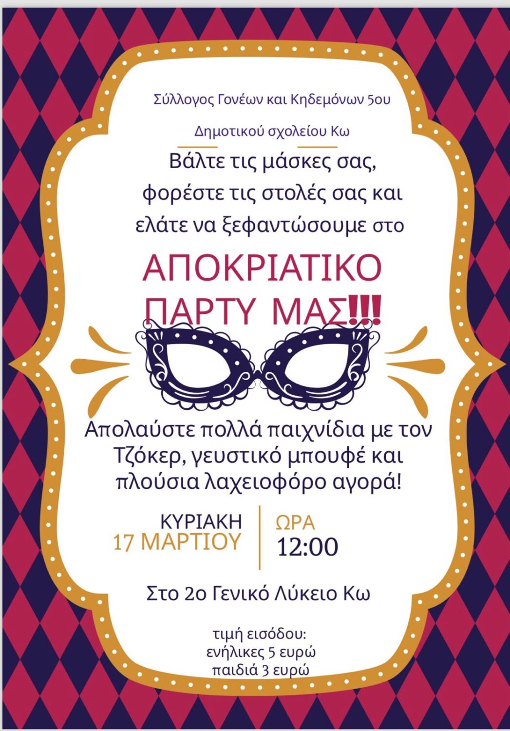Σύλλογος Γονέων και Κηδεμόνων 5ου Δημοτικού Σχολείου Κω: Αποκριάτικο πάρτι