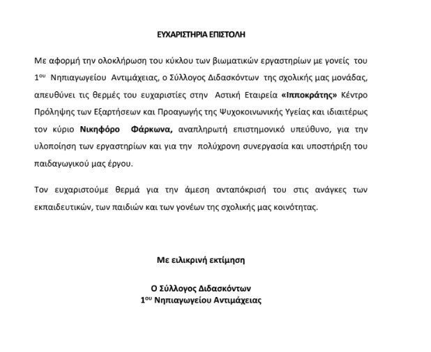Σύλλογος Διδασκόντων 1ου Νηπιαγωγείου Αντιμάχειας: Ευχαριστήρια επιστολή προς Αστική εταιρεία «Ιπποκράτης»