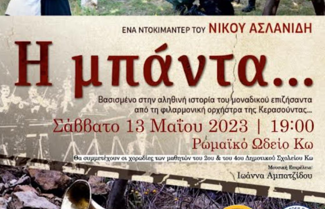 Ο Σύλλογος Ποντίων Κω «Ξενιτέας» στα πλαίσια της επετείου μνήμης της γενοκτονίας των Ποντίων θα προβάλει το Σάββατο 13 Μαΐου στις 19:00 στο Ρωμαϊκό Ωδείο το ντοκιμαντέρ του Νίκου Ασλανίδη «Η Μπάντα», βασισμένο στην αληνινή ιστορία του μοναδικού επιζήζαντα από την Φιλαρμονική Ορχήστρα Κερασούντας.