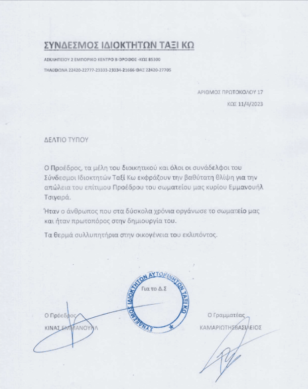 Σύνδεσμος Ιδιοκτητών Ταξί Κω: Συλλυπητήρια για την απώλεια του Εμμανουήλ Τσιγαρά