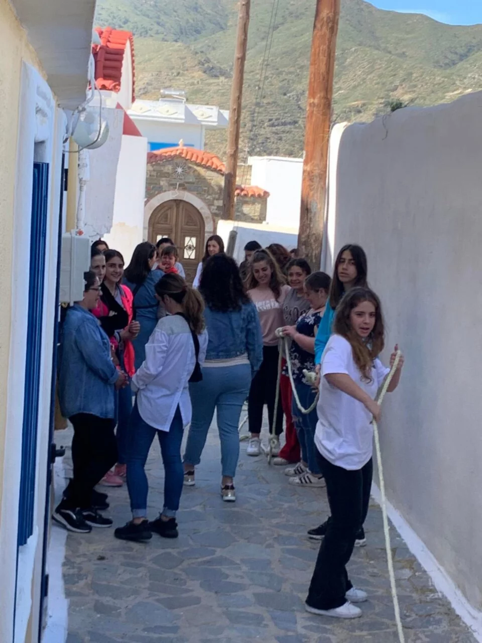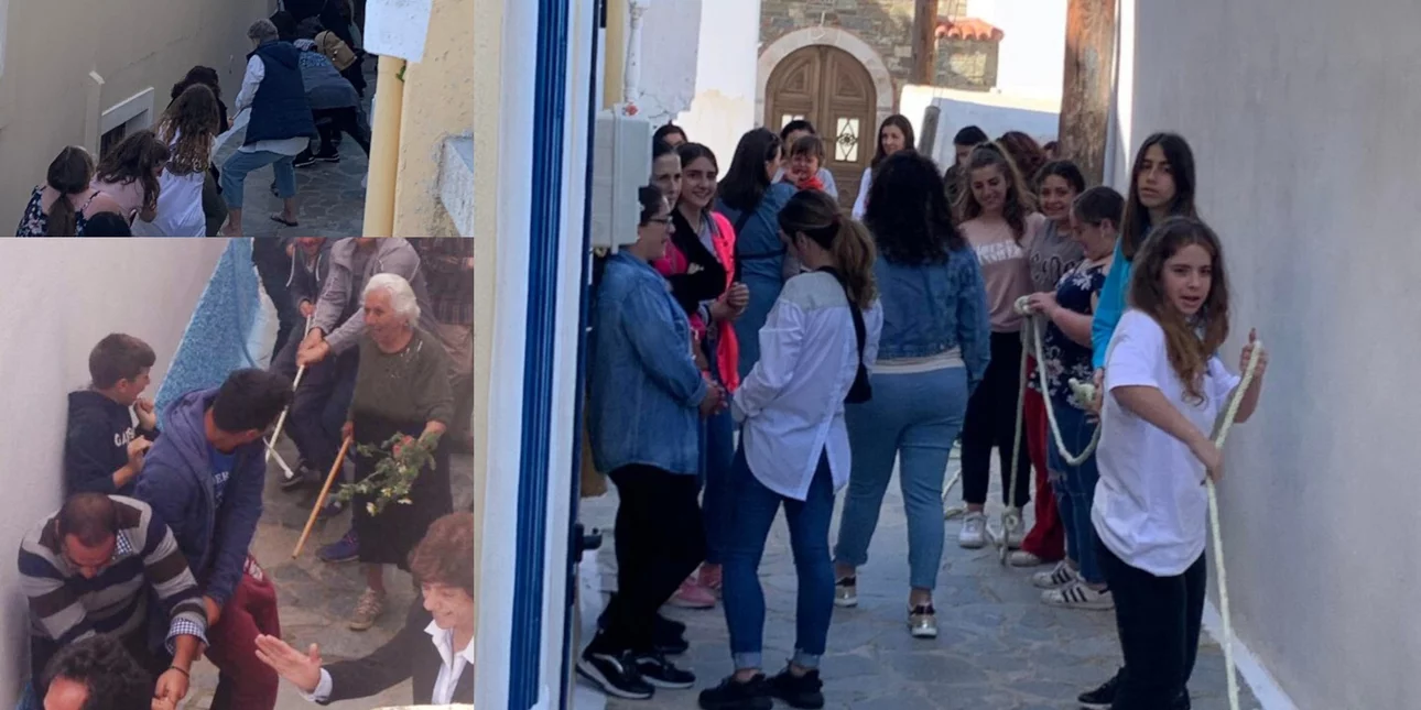 Το στενό στον Χριστό, απ’ τον καφενέ της Μαριγώς ως του Σακέλλη την αυλή, γεμίζει κόσμο, κάθε ηλικίας και φύλου. Παιδάκια 4-5 χρόνων, γριές και γέροι που ξεπερνούν τα ενενήντα, συγκεντρώνονται για να αναλάβει καθένας τον ρόλο του πρωταγωνιστή ή του κομπάρσου.