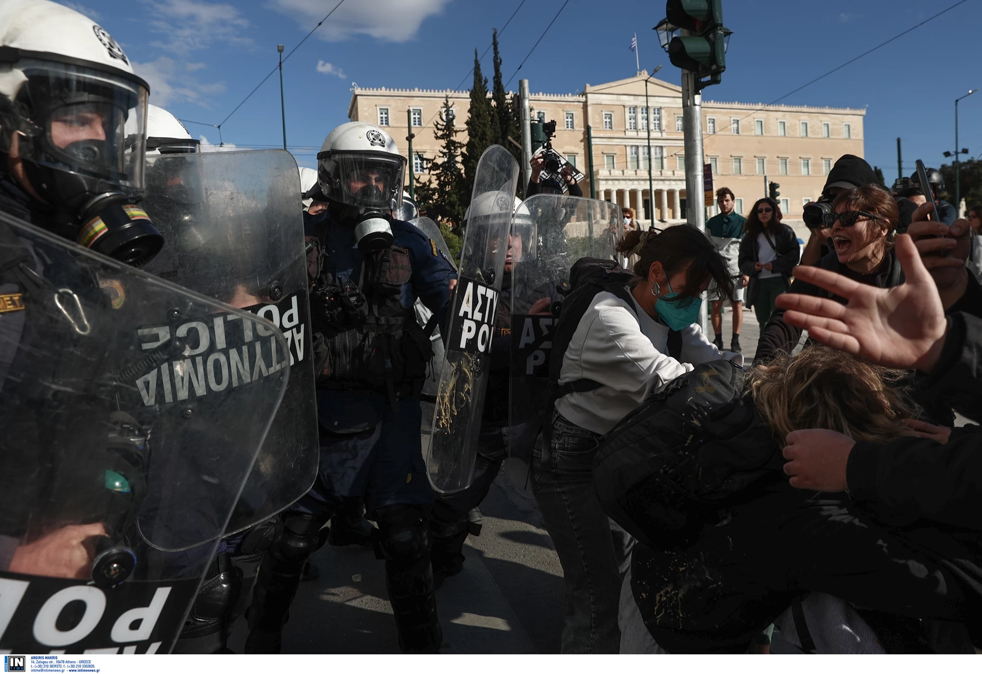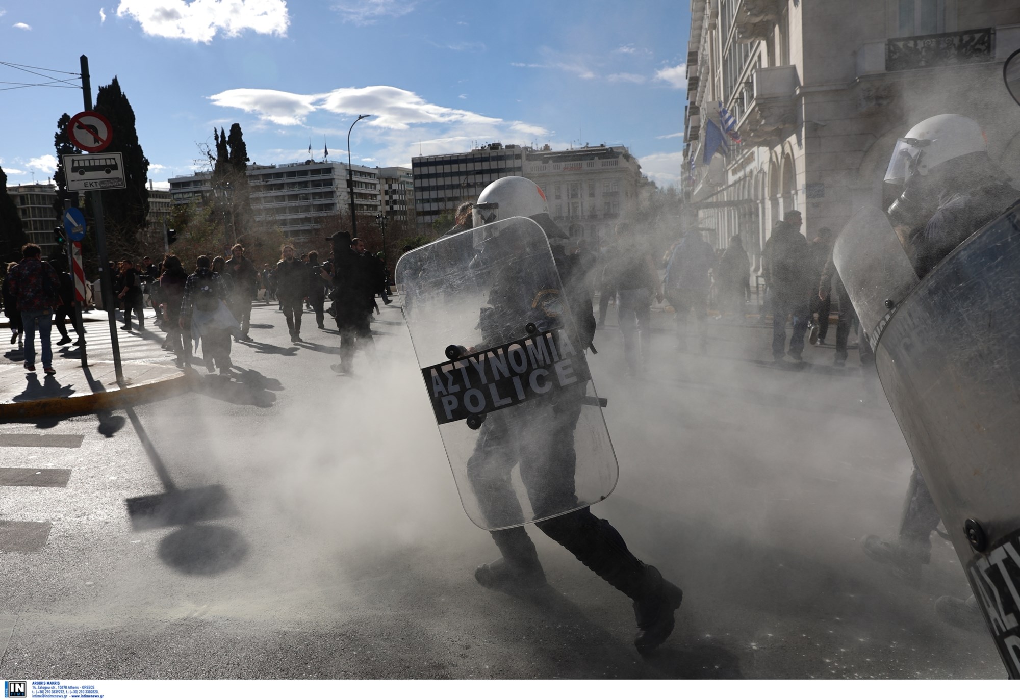 Άγνωστοι πέταξαν μολότοφ και πέτρες και οι αστυνομικές δυνάμεις απάντησαν με χρήση χημικών στην κάτω πλευρά της πλατείας Συνταγματος. Στα Προπύλαια, άγνωστοι πυρπόλησαν με μολότοφ γερανό από τα έργα που γίνονται στην Πανεπιστημίου, ενώ στον ίδιο δρόμο έσπασαν και στάσεις λεωφορείου.