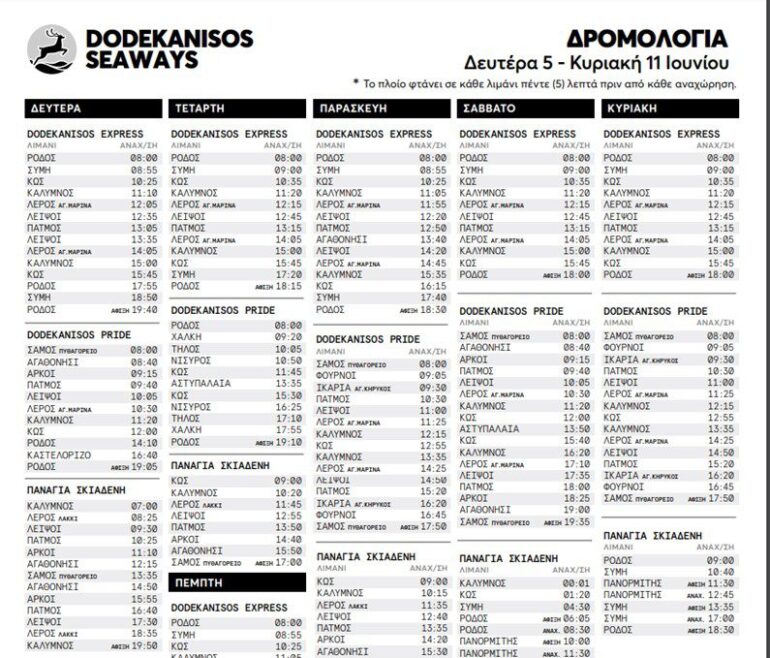 Share Facebook Twitter LinkedIn Pinterest Email Τα δρομολόγια των πλοίων της DODEKANISOS SEAWAYS μέχρι την Κυριακή 11 Ιουνίου 2023. Dodekanisos Seaways