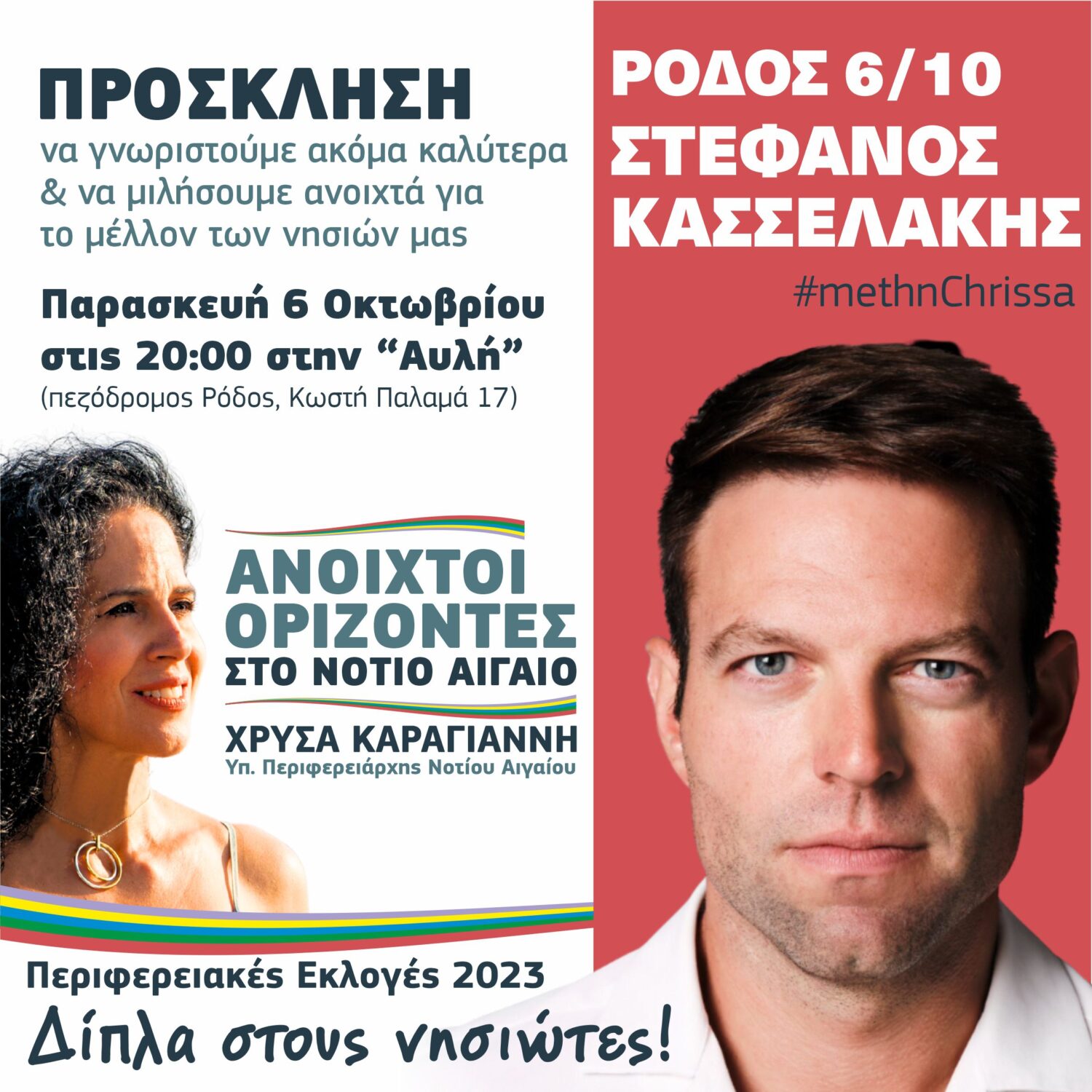 Ο πρόεδρος του ΣΥΡΙΖΑ-ΠΣ, Στέφανος Κασσελάκης, θα δώσει το «παρών» του στην ανοιχτή εκδήλωση της περιφερειακής παράταξης «Ανοιχτοί Ορίζοντες στο Νότιο Αιγαίο» με επικεφαλής την Χρύσα Καραγιάννη.