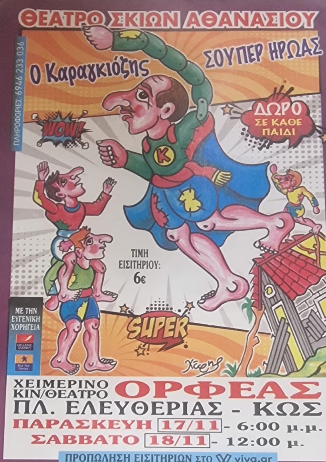 θέλουμε να σας ενημερώσουμε πως η παράσταση του ΘΕΑΤΡΟΥ ΣΚΙΩΝ ΑΘΑΝΑΣΙΟΥ ” Ο Καραγκιόζης Σούπερ Ήρωας” θα γίνει μόνο την Παρασκευή 17 Νοέμβρη στις 6 το απόγευμα.