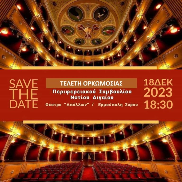Την Δευτέρα 18 Δεκεμβρίου, στις 18:30, στο ιστορικό και υπέροχο Θέατρο “Απόλλων” της Ερμούπολης στη Σύρο, θα πραγματοποιηθεί η Τελετή Ορκωμοσίας του νέου Περιφερειακού Συμβουλίου του Νοτίου Αιγαίου