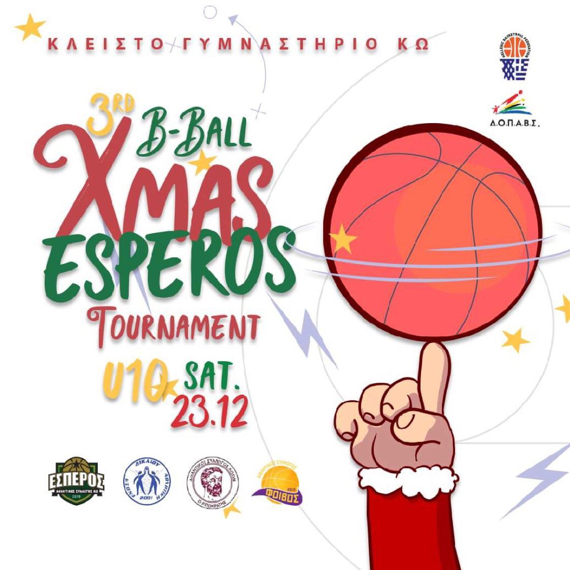 Το 3ο BASKETBALL XMAS ESPEROS TOURNAMENT θα λάβει χώρα στο κλειστό γυμναστήριο της Κω, το Σάββατο 23/12 με τη συμμετοχή του διοργανωτή Έσπερου, του Δικαίου, του Φοίβου και του Ιπποκράτη.