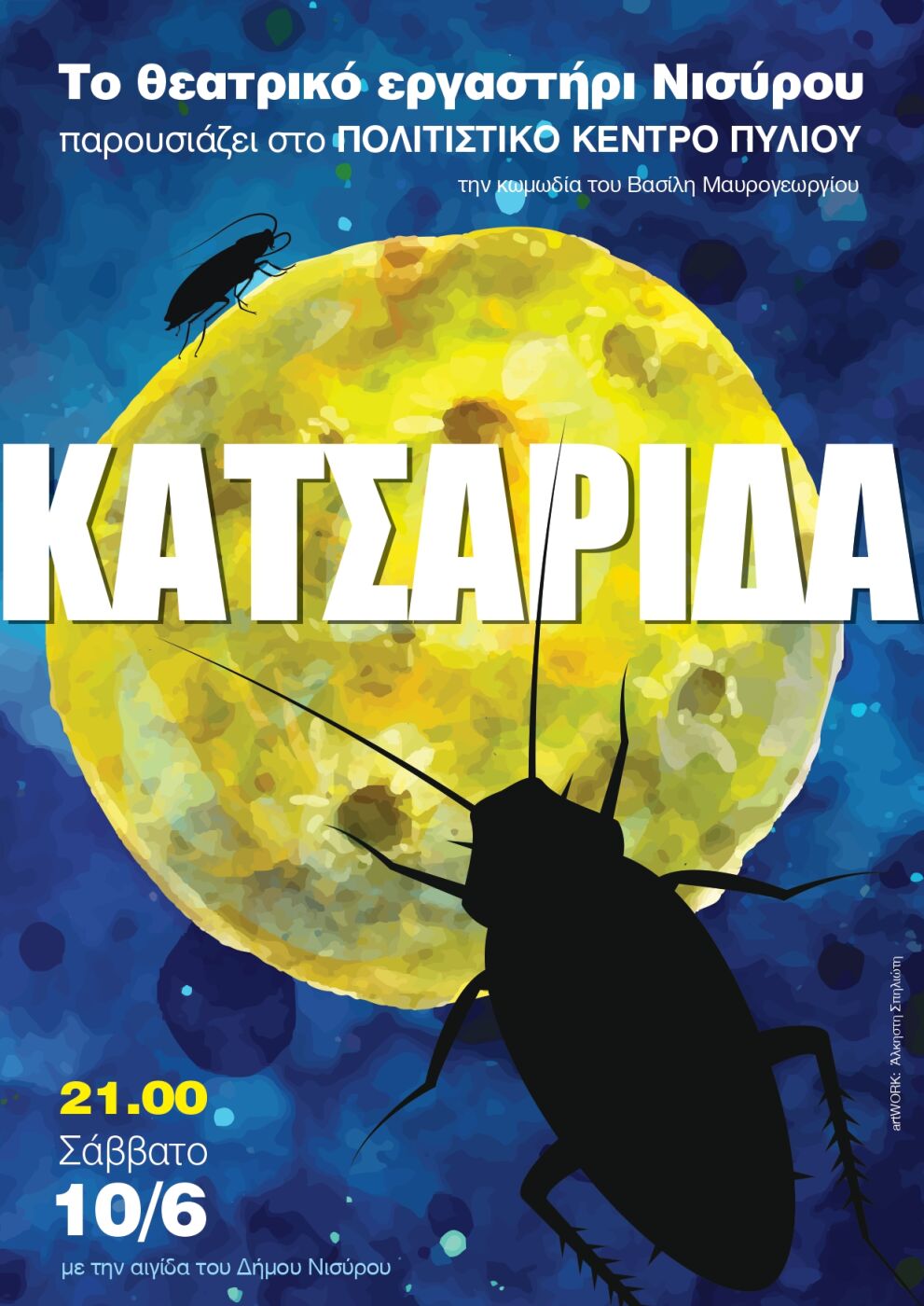 Το θεατρικό εργαστήρι Νισύρου παρουσιάζει την παράσταση «ΚΑΤΣΑΡΙΔΑ», του Βασίλη Μαυρογεωργίου. Εννέα άτομα αναλαμβάνουν να αφηγηθούν με μοναδικά τους εργαλεία το σώμα τους, τη φωνή τους και ελάχιστα σκηνικά, την ιστορία της Ιωάννας, μιας μικρής κόκκινης και εξόριστης κατσαρίδας , η οποία ονειρεύεται να ανέβει στο φεγγάρι.