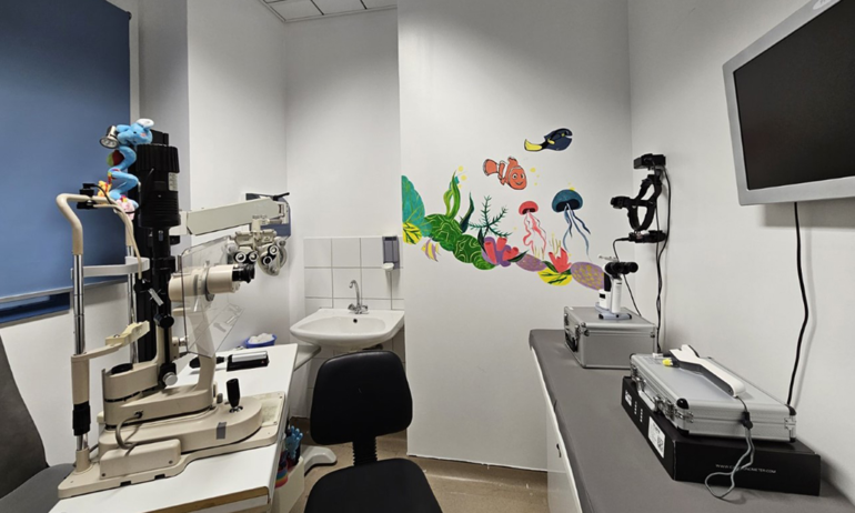 Σε συνδυασμό με τον ήδη υπάρχοντα εξοπλισμό, όπως το έμμεσο οφθαλμοσκόπιο, το φορόπτερο, τη σταθερή σχισμοειδής λυχνία, συνθέτουν ένα πλήρες Παιδοφθαλμολογικό Ιατρείο, σε έναν ειδικά διαμορφωμένο χώρο άνετο και φιλικό για του μικρούς ασθενείς.