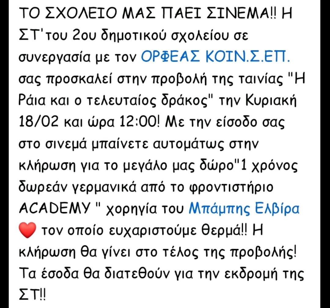 Το 2ο Δημοτικό σχολείο Κω πάει σινεμά… την Κυριακή 18 Φεβρουαρίου