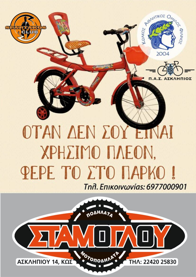 Μετά την επιτυχημένη προσπάθεια των συλλόγων ΠΑΣ Σπάρτακος, ΚΑΟ Φιλίνος, ΠΑΣ Ασκληπιός Κω για δωρεάν παραχώρηση ποδηλάτων αλλά και δωρεάν μαθημάτων στα παιδιά , αποφασίσαμε να προχωρήσουμε σε νέα ενέργεια για την αξιοποίηση παλαιών ποδηλάτων που ίσως κάποιοι να μη χρειάζονται αλλά κάποιοι άλλοι να θέλουν να χρησιμοποιήσουν