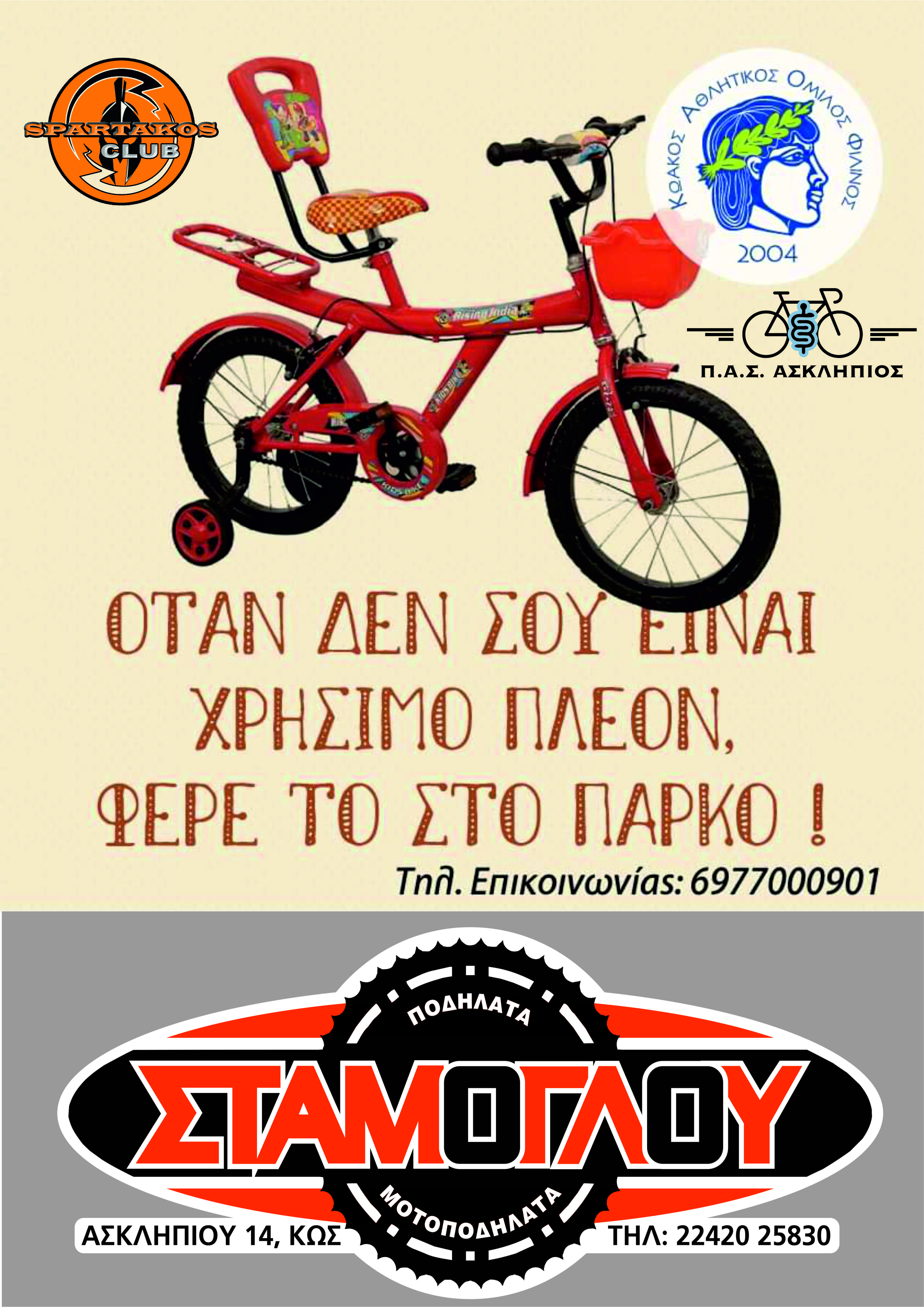 Μετά την επιτυχημένη προσπάθεια των συλλόγων ΠΑΣ Σπάρτακος, ΚΑΟ Φιλίνος, ΠΑΣ Ασκληπιός Κω για δωρεάν παραχώρηση ποδηλάτων αλλά και δωρεάν μαθημάτων στα παιδιά , αποφασίσαμε να προχωρήσουμε σε νέα ενέργεια για την αξιοποίηση παλαιών ποδηλάτων που ίσως κάποιοι να μη χρειάζονται αλλά κάποιοι άλλοι να θέλουν να χρησιμοποιήσουν