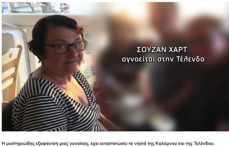 Πρόκειται για τη Σούζαν Χαρτ 75 χρόνων βρετανικής καταγωγής, η οποία εξαφανίστηκε την Κυριακή 30 Απριλίου.