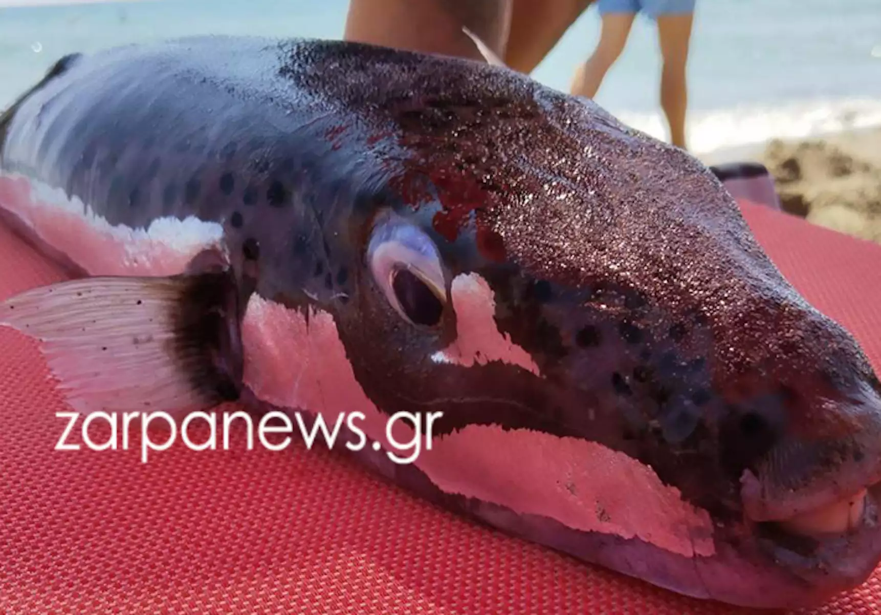 Την Παρασκευή (18.08.2023), ωστόσο, όπως φαίνεται και στις φωτογραφίες του zarpanews.gr, στην παραλία του Φραγκοκάστελλου Χανίων, το ψάρι με τα χαρακτηριστικά δόντια του να είναι εμφανή δεν ήταν το ίδιο τυχερό αφού αυτή τη φορά δεν πρόλαβε να δράσει.