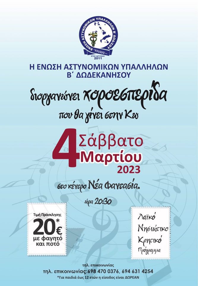 Share Facebook Twitter LinkedIn Pinterest Email Η Ένωσή μας διοργανώνει χοροεσπερίδα στις 4 Μαρτίου 2023 στη νέα Φαντασία! Θα είναι χαρά μας να σε δούμε εκεί! Για αγορά πρόσκλησης παρακαλούμε όπως απευθυνθείτε στα τηλέφωνα 6984700376, 6946314254 ή στο γραφείο της Ένωσης. Ένωση Αστυνομικών Υπαλλήλων Β. Δωδ/σου