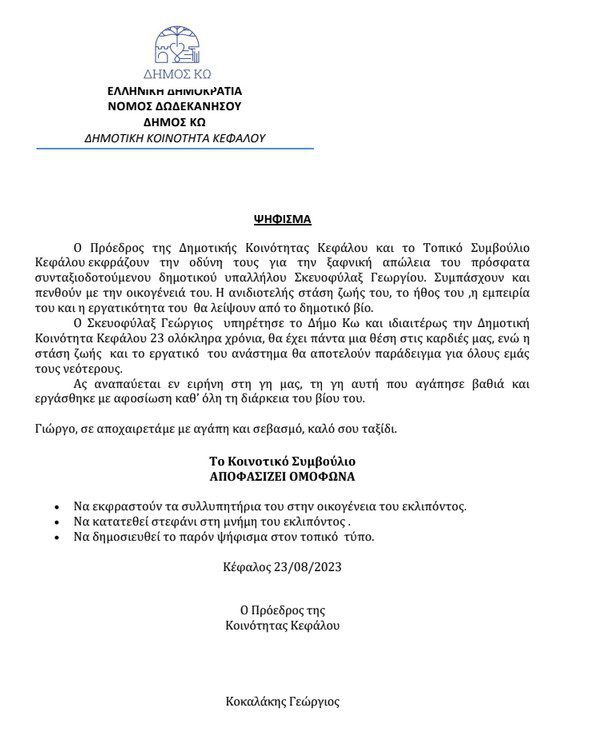 Ψήφισμα κοινότητας Κεφάλου για τον ξαφνικό θάνατο του Γιώργου Σκευοφύλαξ