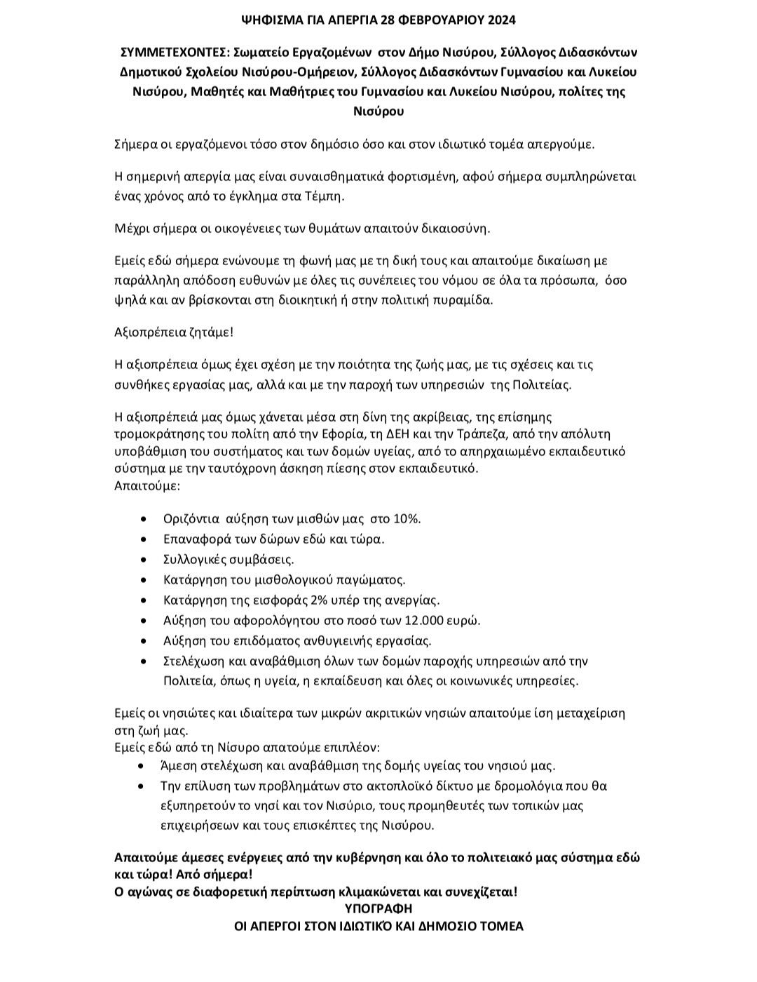 Ψήφισμα των απεργών της 28ης Φεβρουαρίου 2024 από τη Νίσυρο