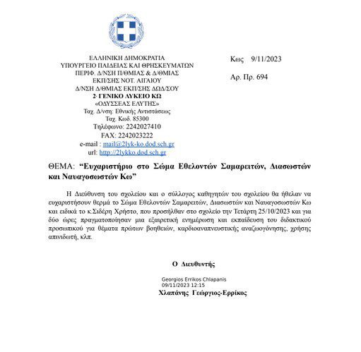 2ο ΓΕΛ Κω: Ευχαριστήριο στο Σώμα Εθελοντών Σαμαρειτών Διασωστών και Ναυαγοσωστών Κω