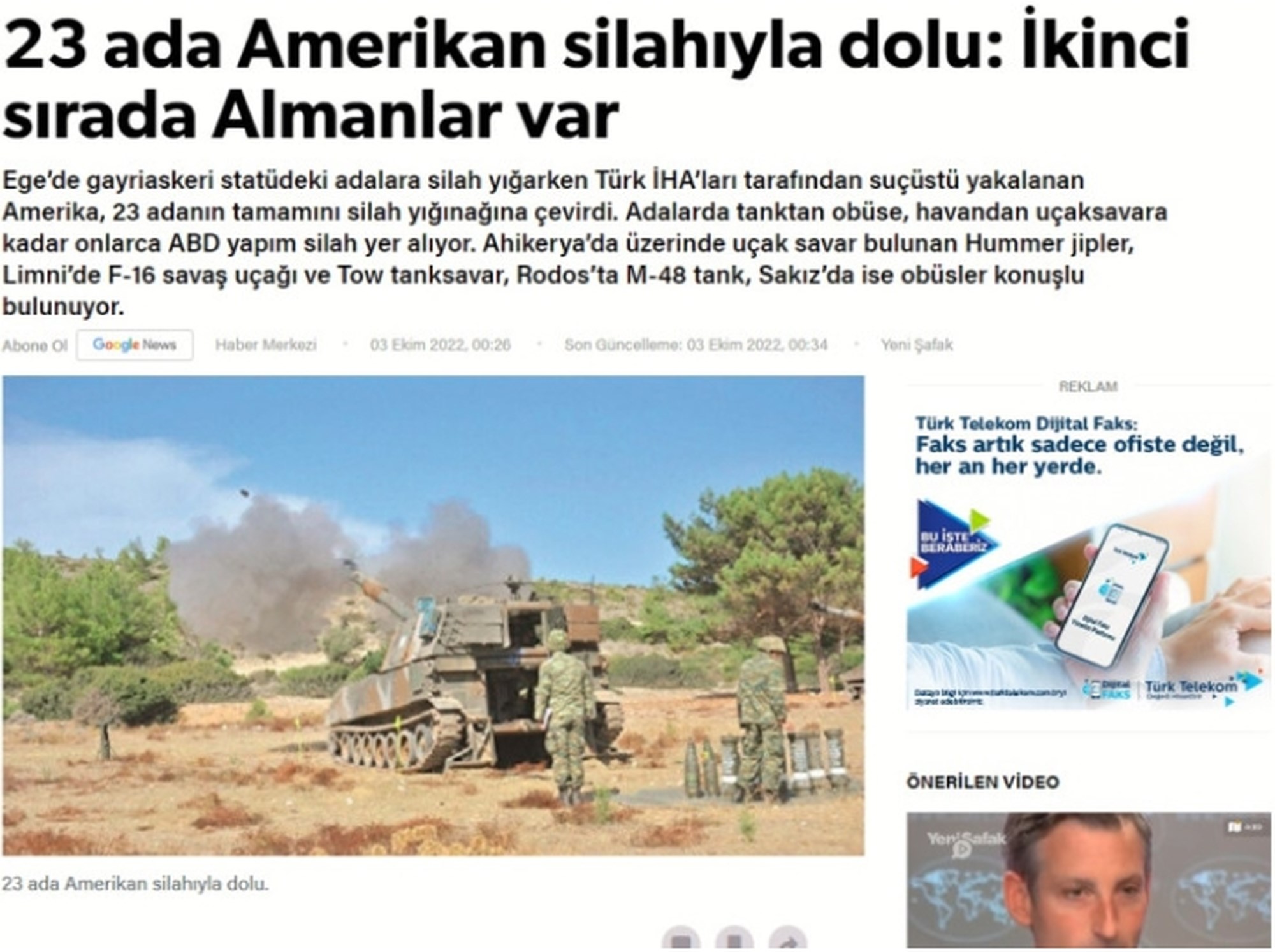 “Στην Ικαρία αντιαεροπορικά, στη Λήμνο F-16 και αντιαρματικά, στη Ρόδο άρματα μάχης και στη Χίο πυροβόλα” υποστηρίζει η εφημερίδα, με τα τουρκικά ΜΜΕ να συνεχίζουν να “φτιάχνουν κλίμα” κατά της πατρίδας μας.