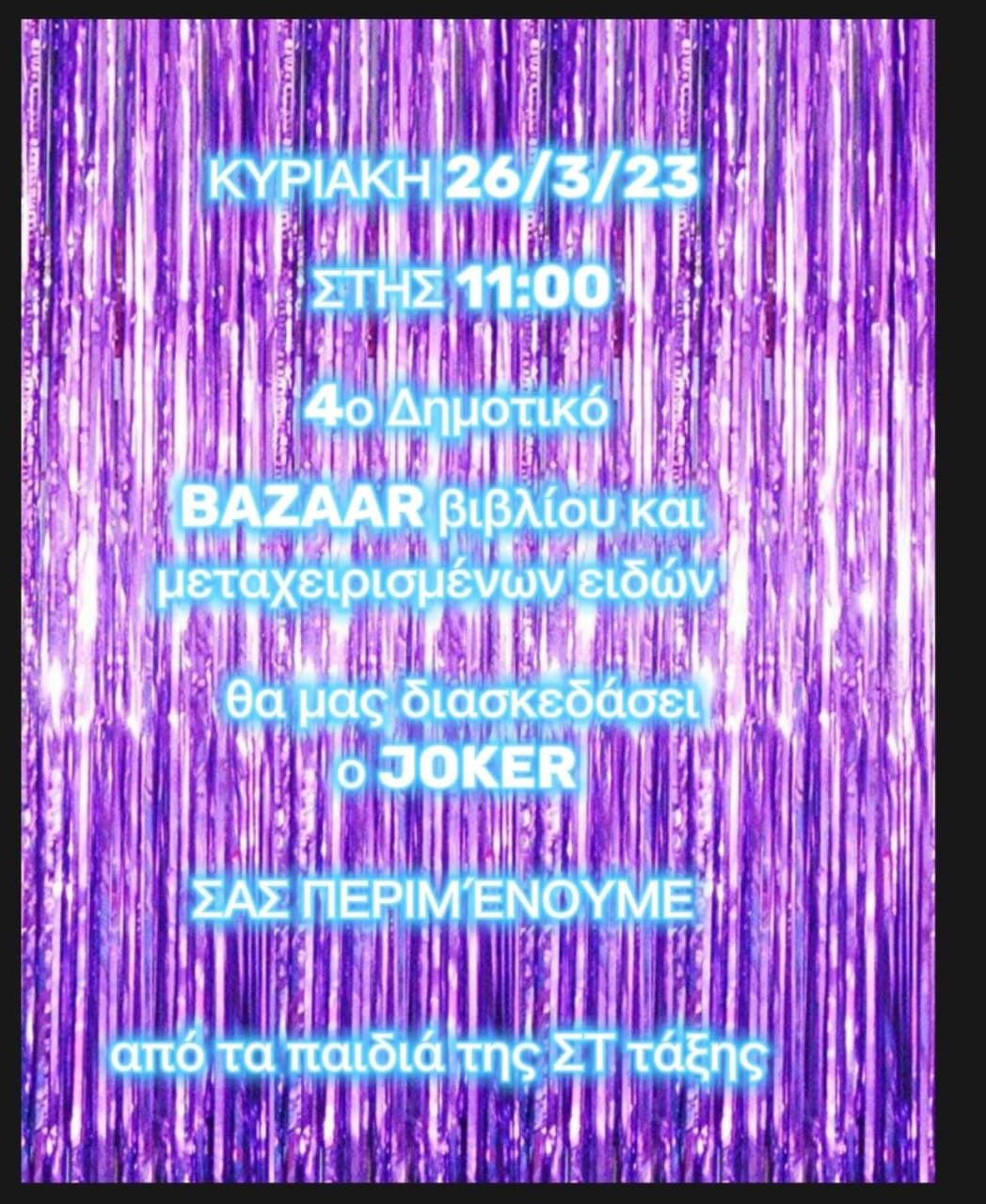 Share Facebook Twitter LinkedIn Pinterest Email Μπαζαρ μεταχειρισμένων βιβλίων και ρούχων την Κυριακή στις 11.00 στο 4 Δημοτικό σχολείο Κω με την παρουσία του Τζόκερ. Μεταχειρισμένα