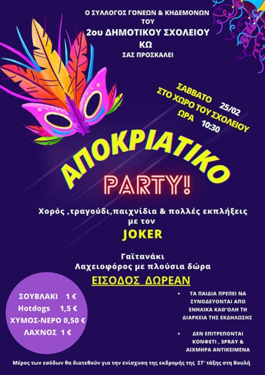 Share Facebook Twitter LinkedIn Pinterest Email Aποκριάτικο πάρτυ από το Σύλλογο Γονέων του 2ου Δημοτικού Σχολείου Κω Αποκριάτικη εκδήλωση
