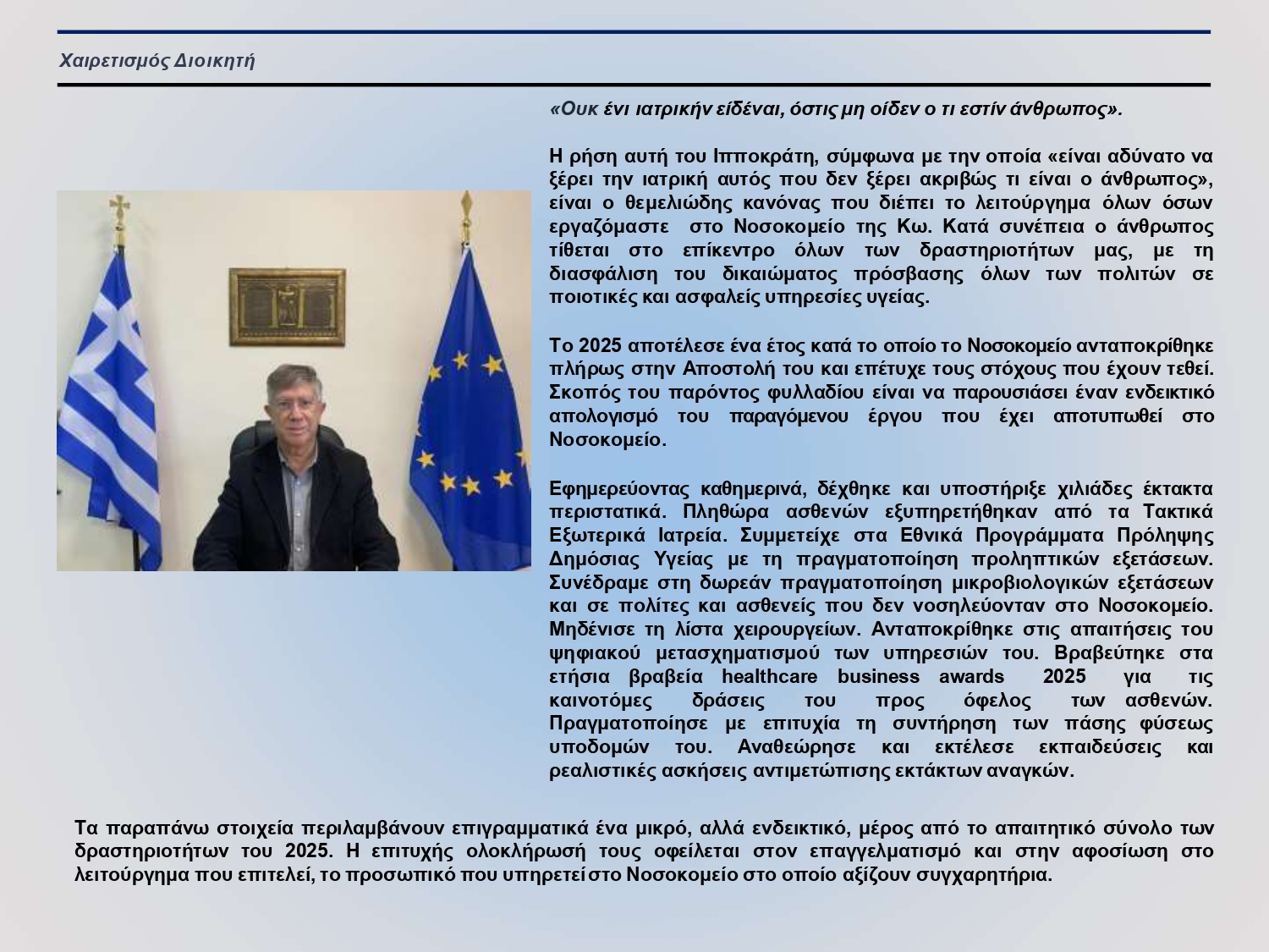 Όπως επισημαίνεται στον χαιρετισμό του Διοικητή κ. Νικολάου Φανιού, το 2025 υπήρξε μια χρονιά κατά την οποία το Νοσοκομείο ανταποκρίθηκε πλήρως στην αποστολή του, θέτοντας τον άνθρωπο στο επίκεντρο και διασφαλίζοντας την ισότιμη πρόσβαση όλων σε ποιοτικές και ασφαλείς υπηρεσίες υγείας.