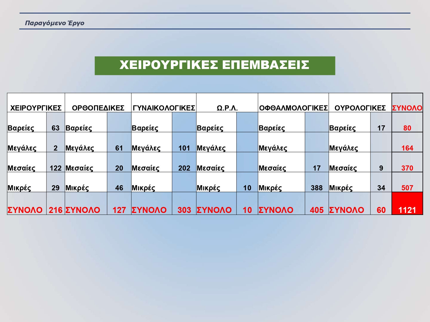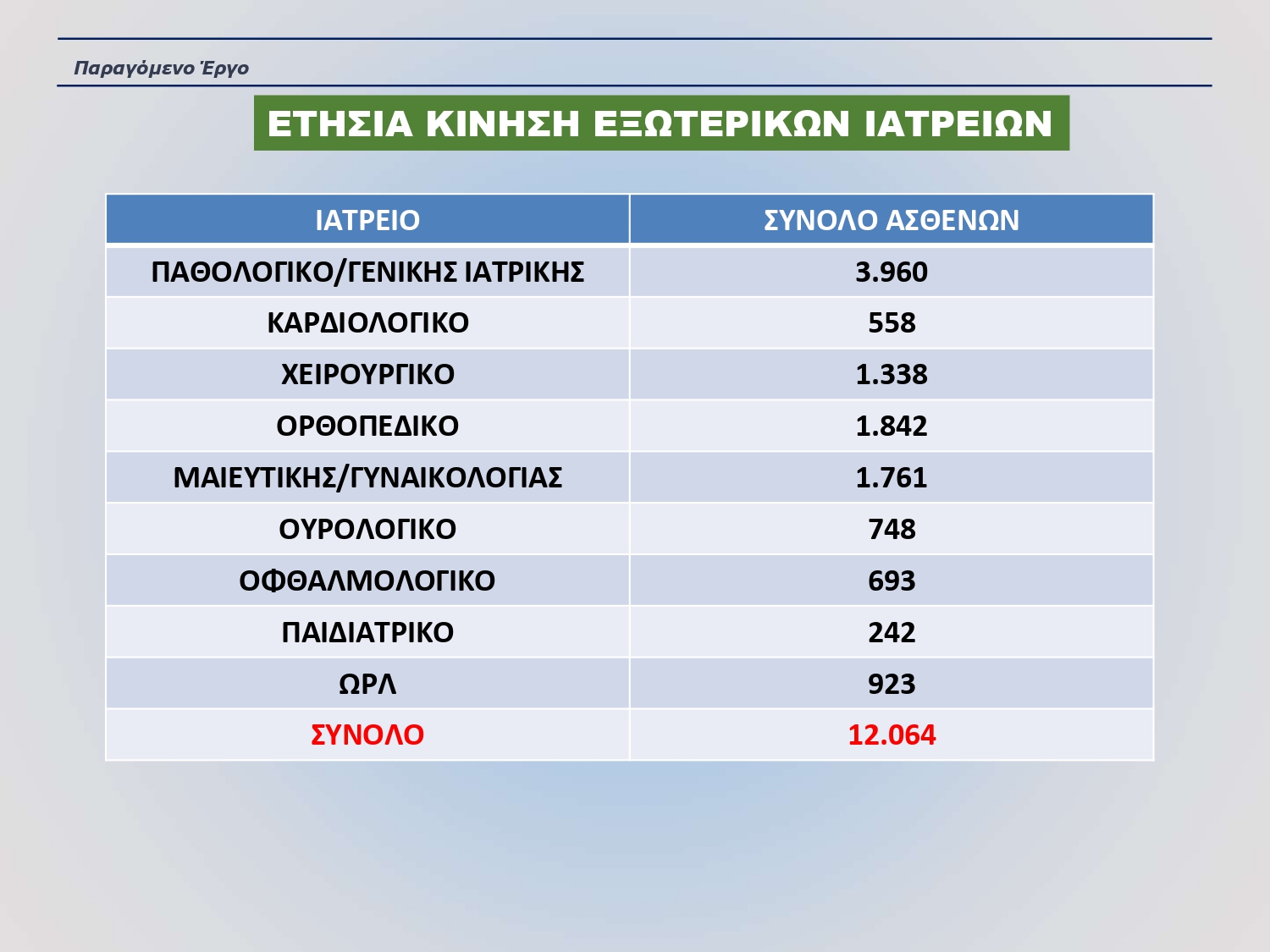 Το 2025 πραγματοποιήθηκαν 1.121 χειρουργικές επεμβάσεις, καλύπτοντας ένα ευρύ φάσμα ειδικοτήτων (γενική χειρουργική, ορθοπεδική, γυναικολογική, ουρολογική, οφθαλμολογική και ΩΡΛ), ενώ μηδενίστηκε η λίστα αναμονής χειρουργείων, στοιχείο ιδιαίτερης σημασίας για τη δημόσια υγεία.