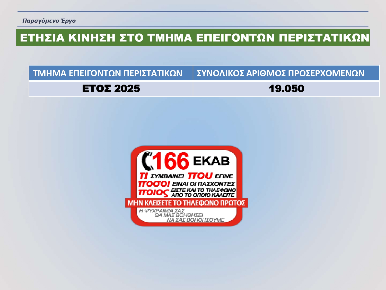 Κατά τη διάρκεια του 2025, το Νοσοκομείο Κω εφημέρευε καθημερινά, υποδεχόμενο και διαχειριζόμενο 19.050 περιστατικά στο Τμήμα Επειγόντων Περιστατικών. Παράλληλα, στα Τακτικά Εξωτερικά Ιατρεία εξυπηρετήθηκαν 12.064 ασθενείς, ενώ οι νοσηλείες εσωτερικών ασθενών ανήλθαν σε 3.836 εισαγωγές, με 8.093 συνολικές ημέρες νοσηλείας σε όλα τα τμήματα.