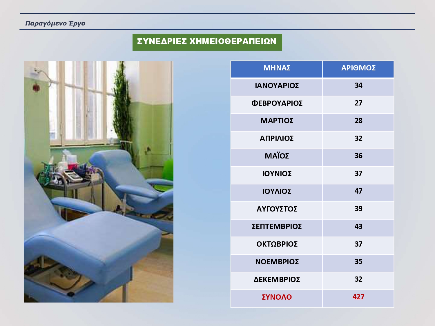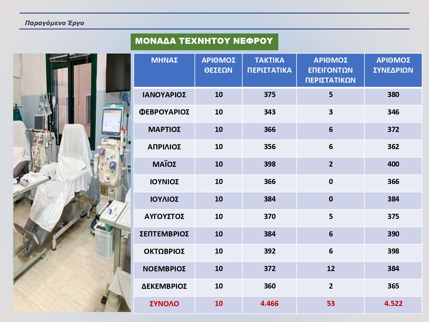 Η Μονάδα Τεχνητού Νεφρού λειτούργησε με πληρότητα, πραγματοποιώντας 4.522 συνεδρίες αιμοκάθαρσης, ενώ καταγράφηκαν και 427 συνεδρίες χημειοθεραπείας, επιβεβαιώνοντας τον κρίσιμο ρόλο του Νοσοκομείου στη φροντίδα χρονίως πασχόντων.