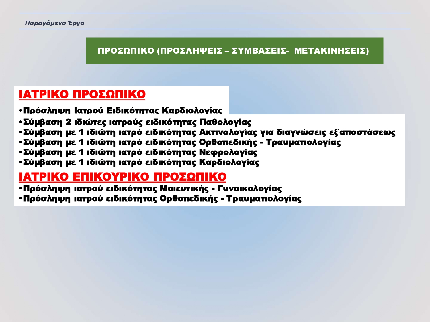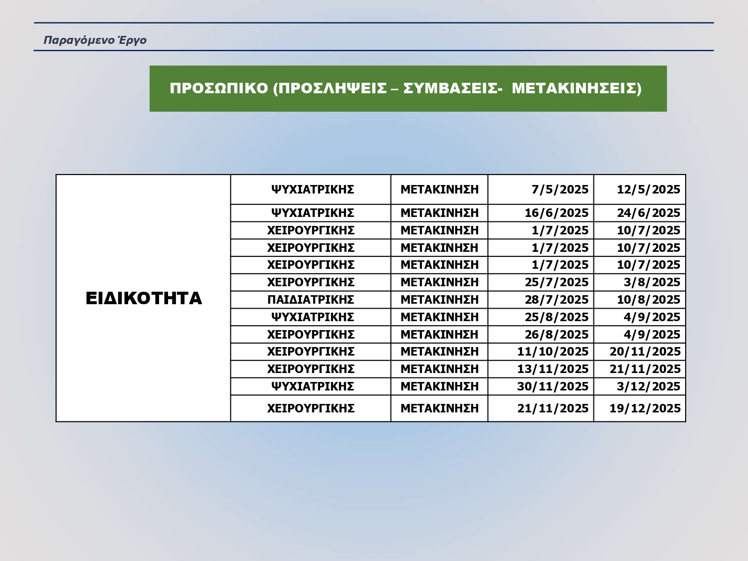 • προσλήψεις και συμβάσεις ιατρών διαφόρων ειδικοτήτων (καρδιολογία, παθολογία, ακτινολογία, ορθοπεδική, νεφρολογία),