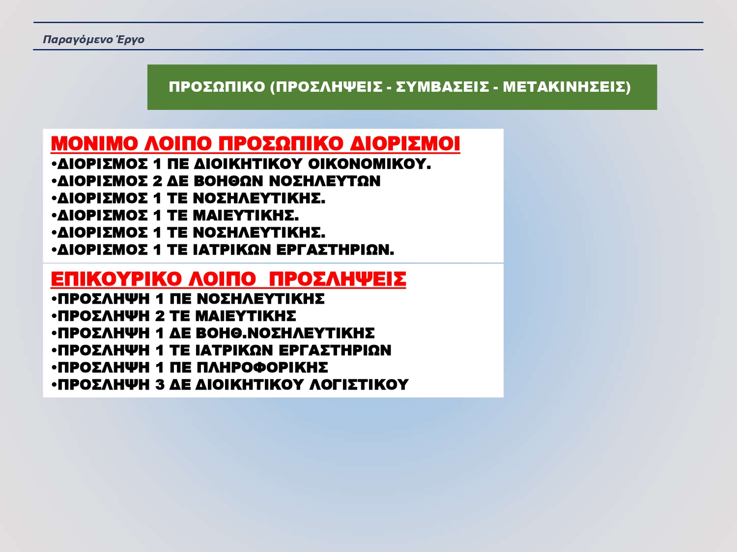 • προσλήψεις επικουρικού και λοιπού προσωπικού (νοσηλευτές, μαίες, διοικητικό και τεχνικό προσωπικό),