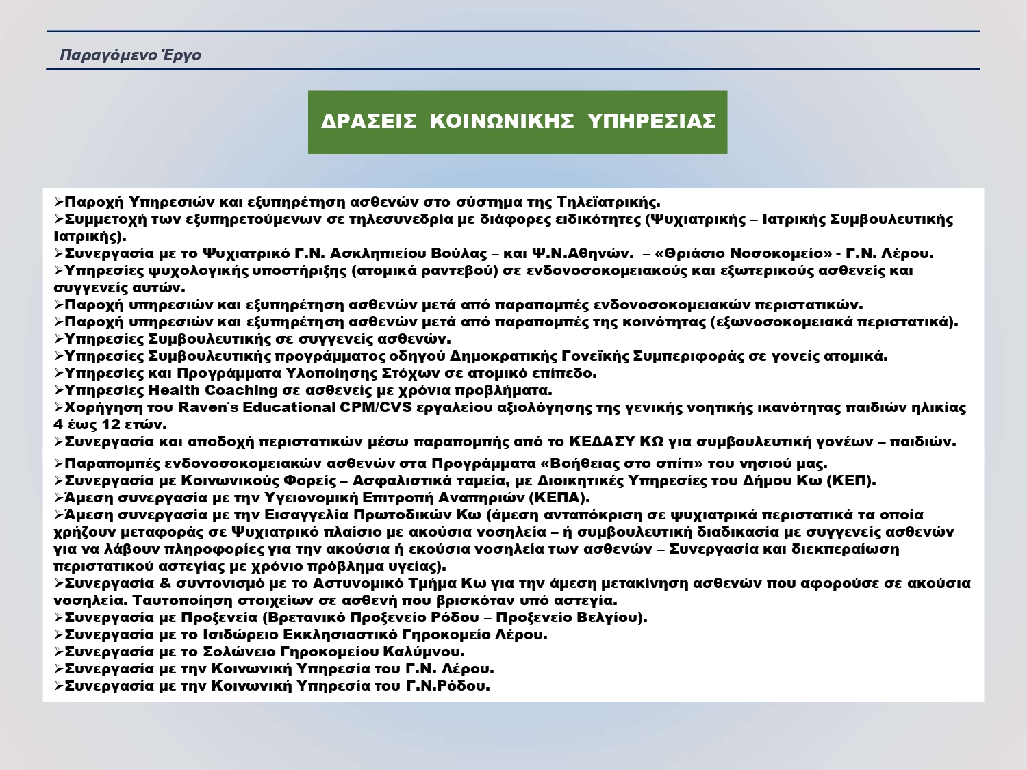 Ιδιαίτερη έμφαση δόθηκε στις δράσεις αγωγής υγείας σε σχολικές μονάδες, με προγράμματα για τον σχολικό εκφοβισμό, τις πρώτες βοήθειες, τη σεξουαλική υγεία και τη δωρεά οργάνων, προσεγγίζοντας 1.334 μαθητές και 120 εκπαιδευτικούς. Παράλληλα, η Κοινωνική Υπηρεσία ανέπτυξε εκτεταμένο έργο ψυχοκοινωνικής υποστήριξης, τηλεϊατρικής και συνεργασιών με φορείς υγείας και κοινωνικές δομές.