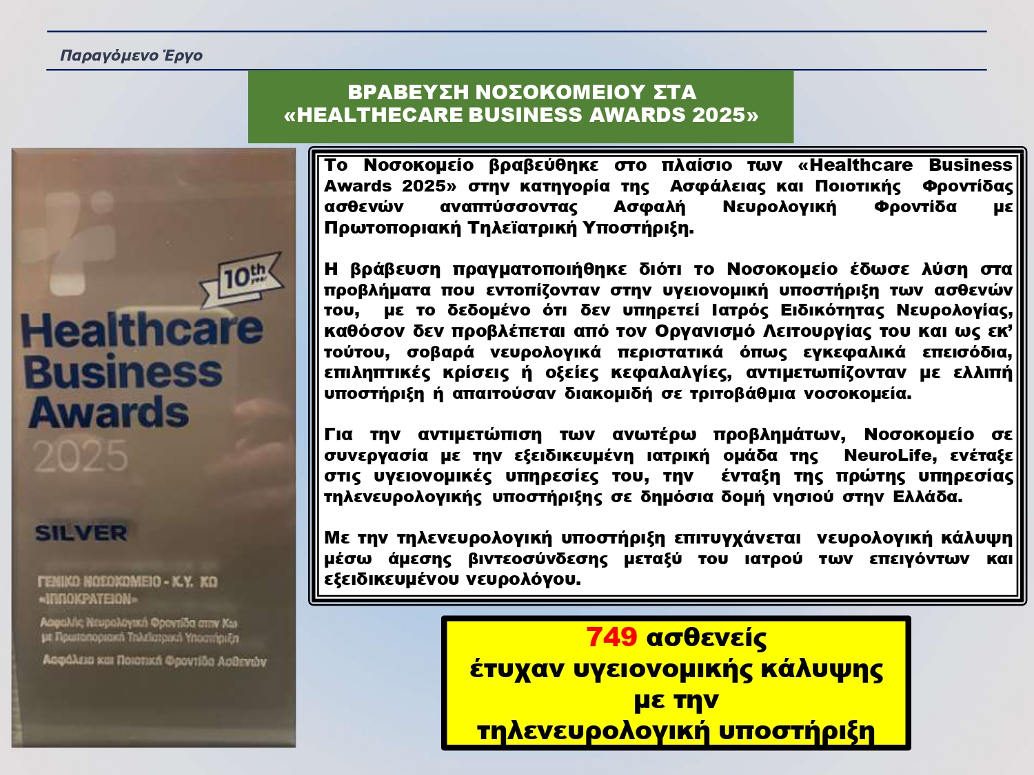 Σημαντική διάκριση αποτέλεσε η βράβευση του Νοσοκομείου στα Healthcare Business Awards 2025, για την εφαρμογή τηλενευρολογικής υποστήριξης, μια πρωτοποριακή δράση που κάλυψε κρίσιμο κενό νευρολογικής φροντίδας, προσφέροντας υποστήριξη σε 749 ασθενείς.