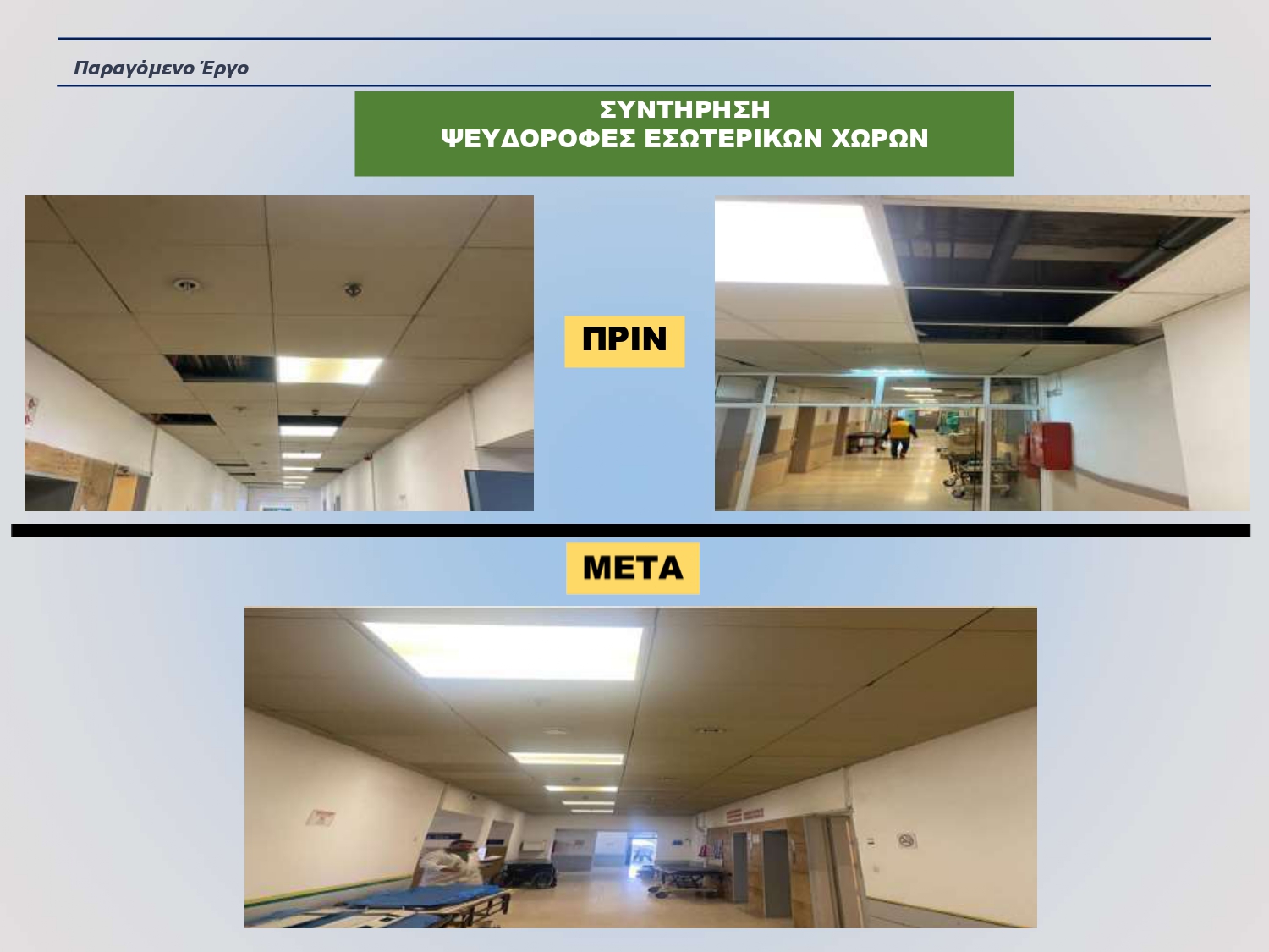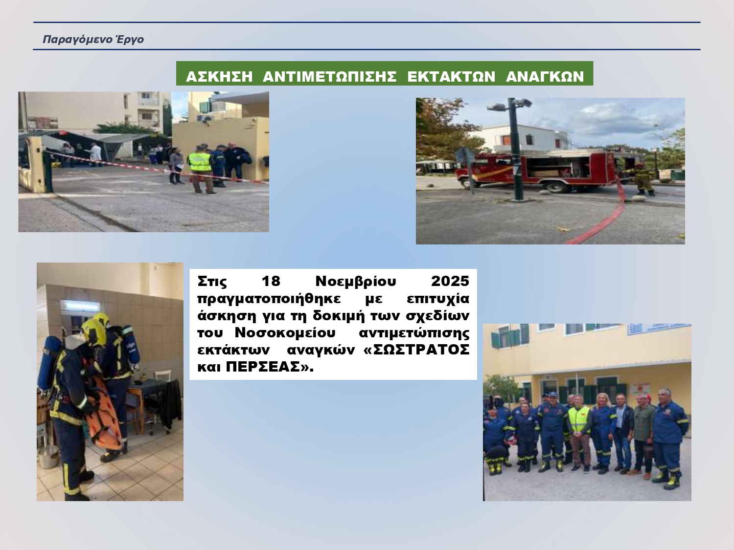 Το 2025 υλοποιήθηκε εκτεταμένο πρόγραμμα συντήρησης ιατροτεχνολογικού εξοπλισμού, αναβάθμισης ψηφιακών συστημάτων και βελτίωσης κτιριακών εγκαταστάσεων. Παράλληλα, πραγματοποιήθηκε επιτυχώς άσκηση αντιμετώπισης εκτάκτων αναγκών με τα σχέδια «ΣΩΣΤΡΑΤΟΣ» και «ΠΕΡΣΕΑΣ», ενισχύοντας την επιχειρησιακή ετοιμότητα του Νοσοκομείου.