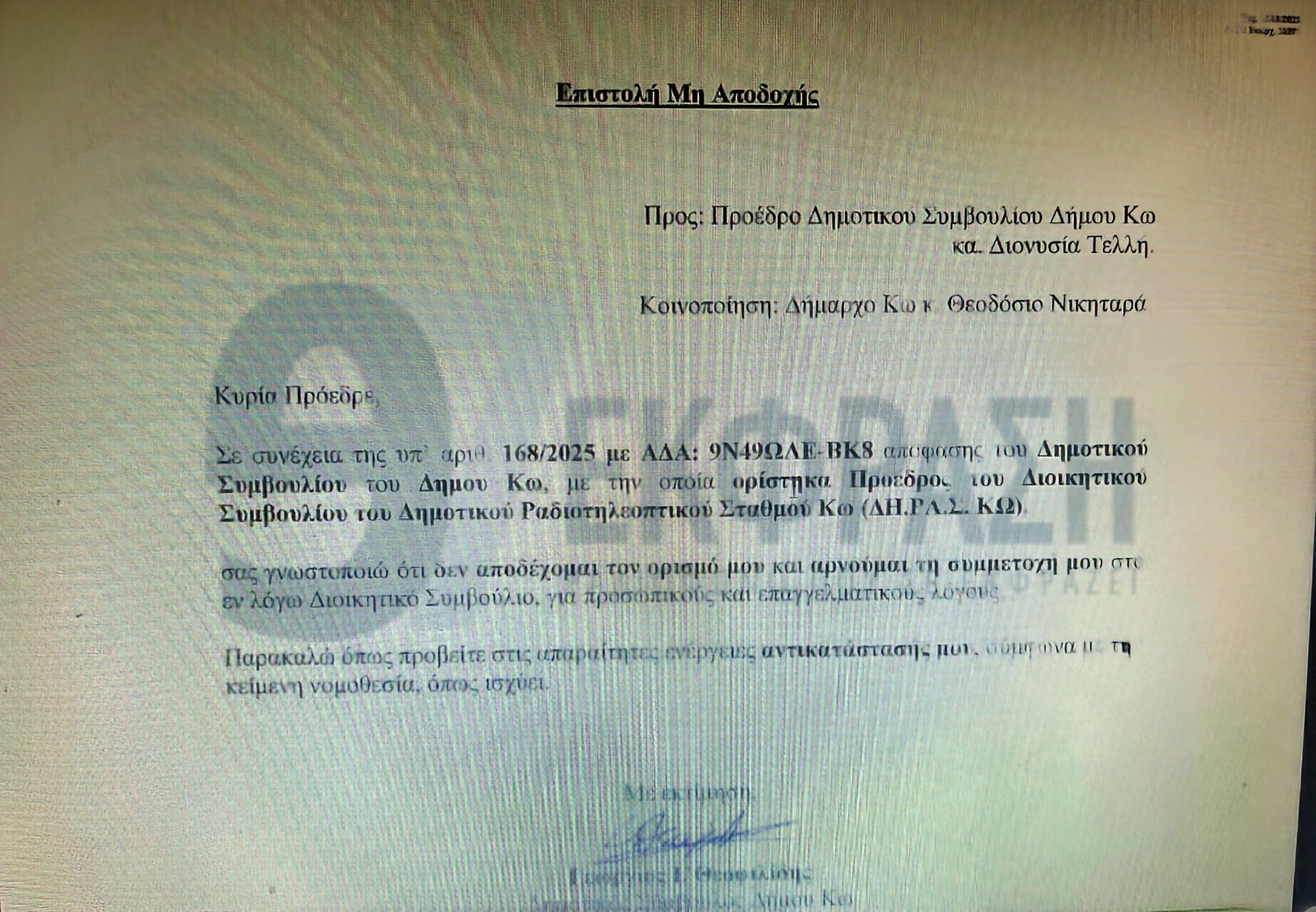 Με επιστολή προς την Πρόεδρο του Δημοτικού Συμβουλίου και κοινοποίηση στον Δήμαρχο Κω, δηλώνει ότι δεν αποδέχεται τον διορισμό του για προσωπικούς και επαγγελματικούς λόγους