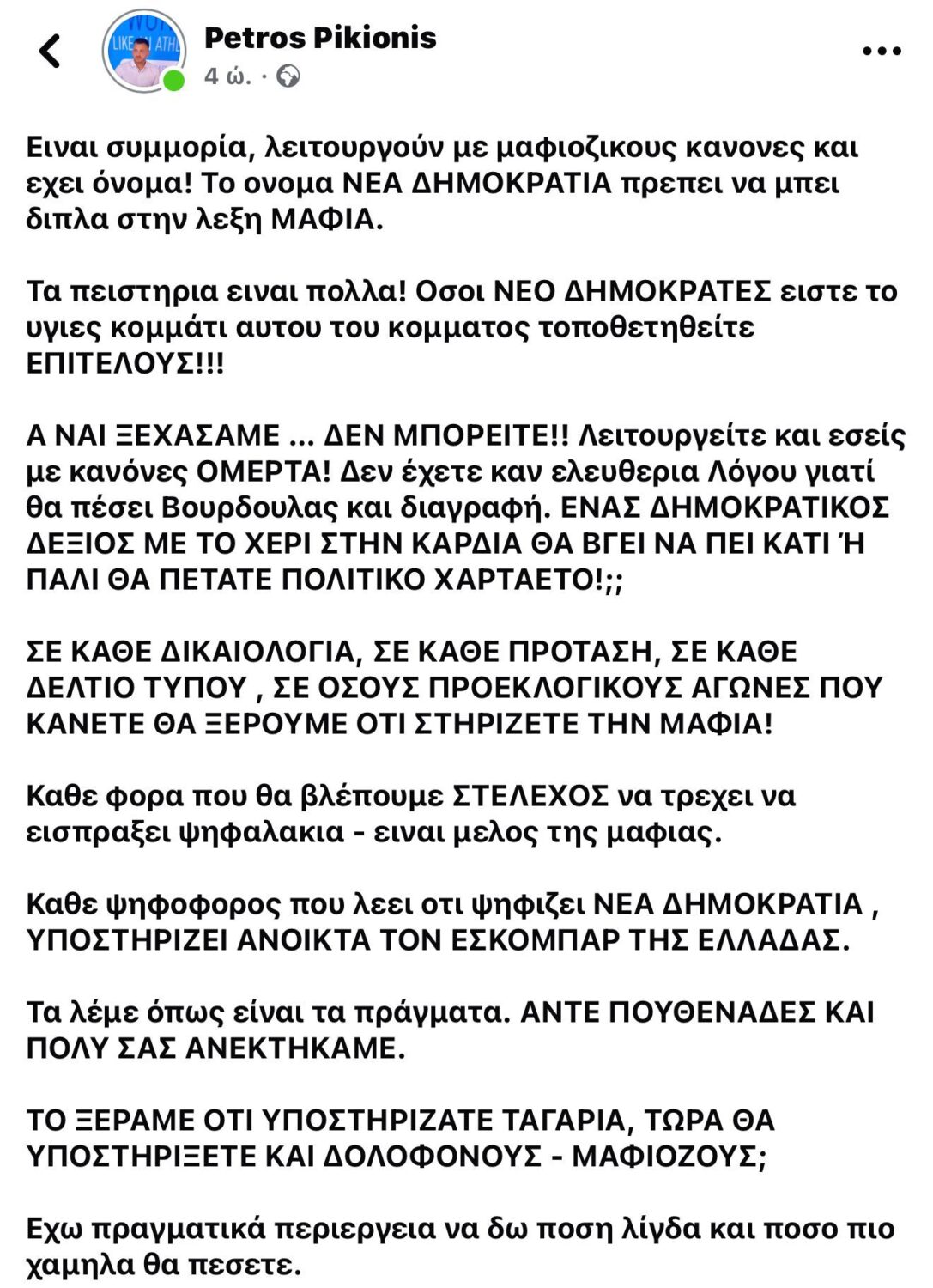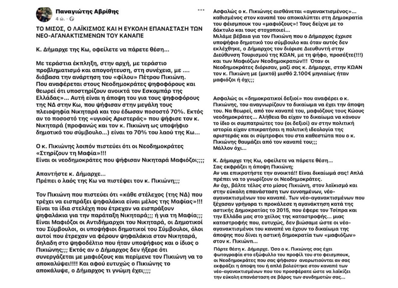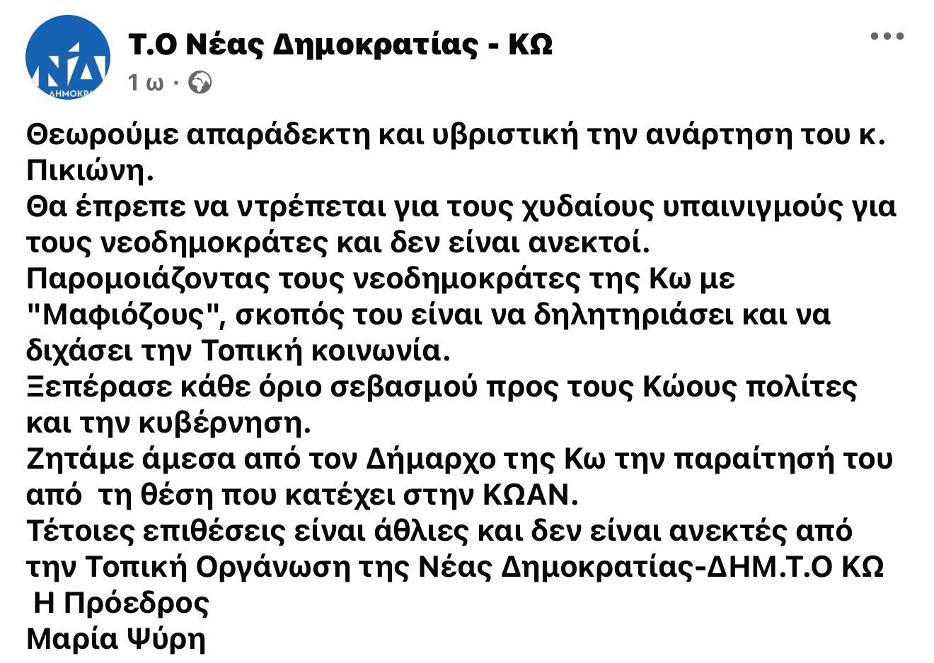 Σάλος προκλήθηκε το βράδυ της Δευτέρας 18/2 μετά από την ακραία προσβλητική απέναντι στους συμπολίτες μας – φίλους της Νέας Δημοκρατίας ανάρτηση του διευθυντή τουρισμού της ΚΩΑΝ ΑΕ και πρώην υποψηφίου δημοτικού συμβούλου με την παράταξη της Ισχυρής Κω κυρίου Πέτρου Πικιώνη, ο οποίος στον προσωπικό του λογαριασμό στο facebook αποκάλεσε τους “νεοδημοκράτες” ως “μαφιόζους” υποστηρικτές του “Εσκομπάρ” της Ελλάδας.
