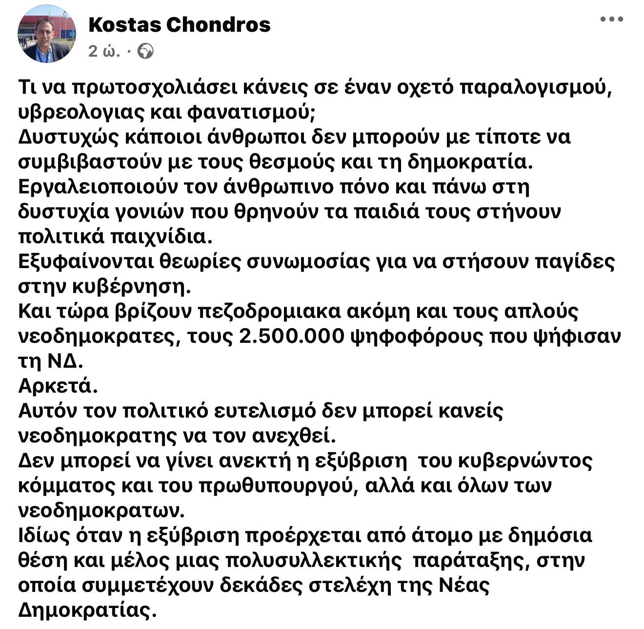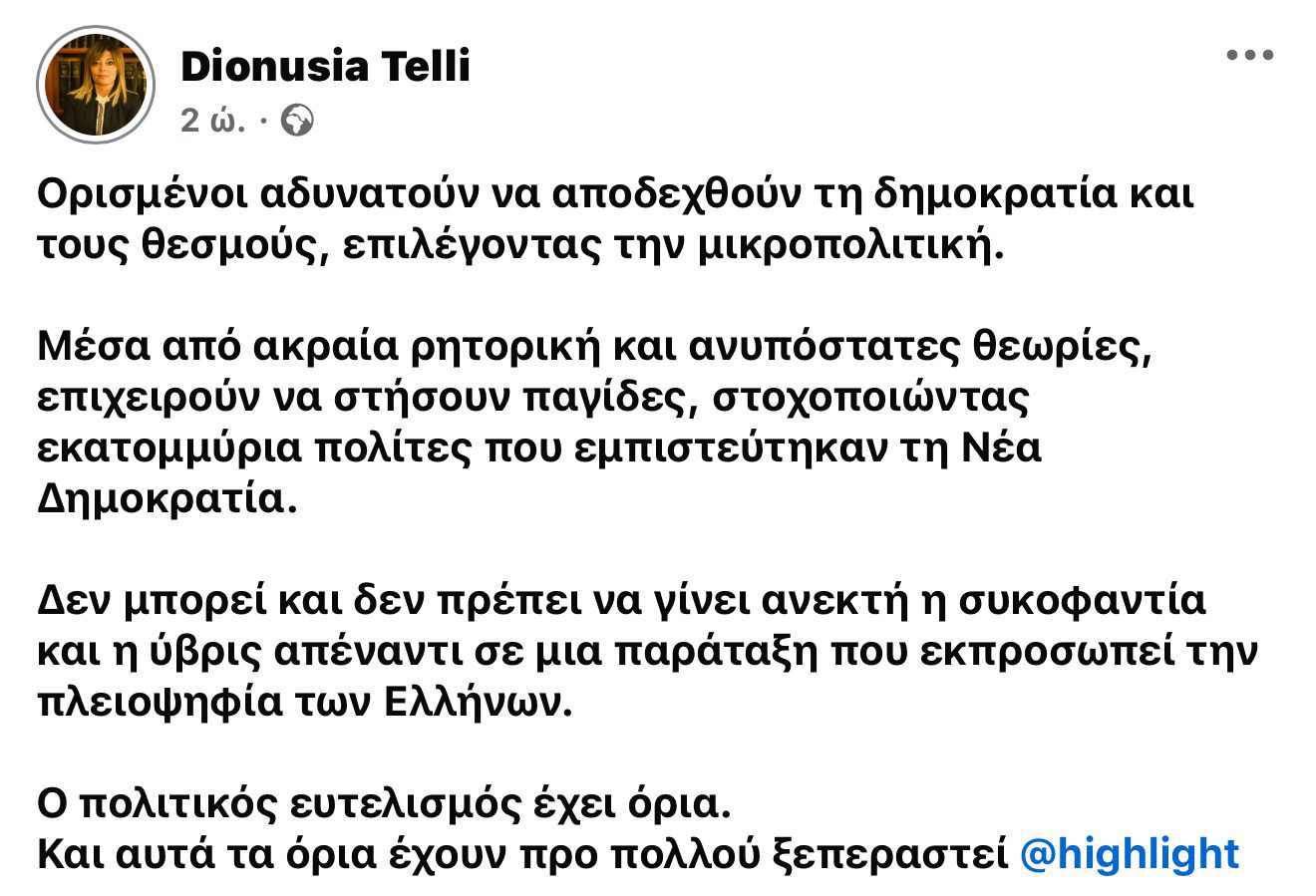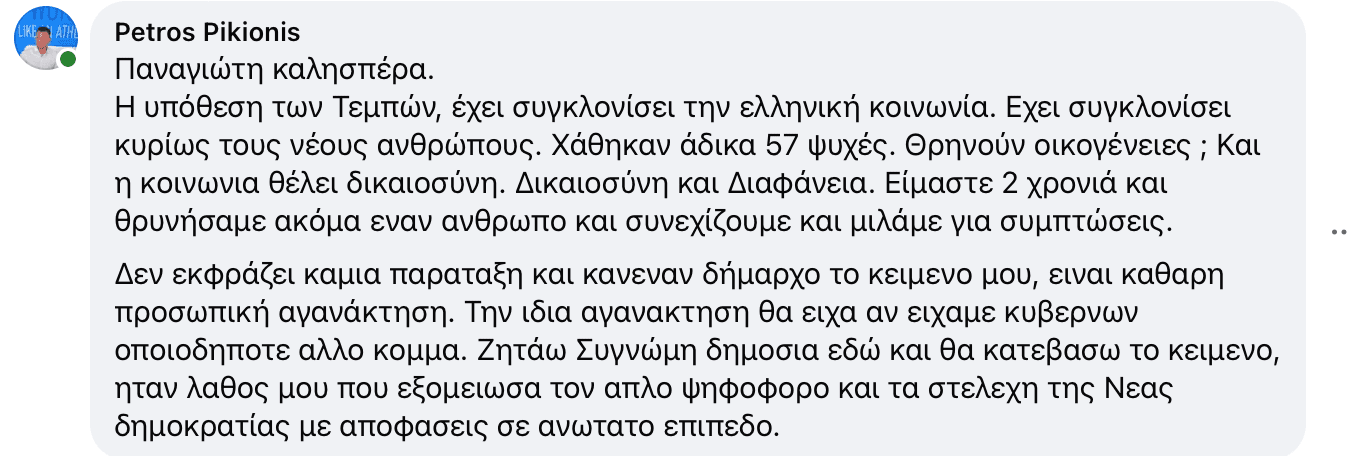 Οφείλουμε όμως, με σεβασμό στη μνήμη τους, να μην οδηγούμαστε σε ακρότητες και ιδιαίτερα σε λεκτικές αναφορές που τραυματίζουν την κοινωνική συνοχή . Η ανάρτηση του διευθυντή της Διεύθυνσης Τουρισμού, ήταν κατά την άποψη μου άστοχη και βαθιά προσβλητική απέναντι στον απλό κόσμο της Ν.Δ., που προφανώς δεν μπορεί επ’ ουδενί να συνδέεται έστω και συνειρμικά με την υπόθεση των Τεμπών.